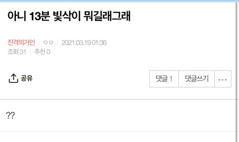 어제 벽판에 13분 빛삭이 뭐길래 이리 반응이 뜨거운거야? 제발 이따 12시에 누가 좀 13분 빛삭좀 올려주라 ㅠㅠㅠㅠㅠ 절 할게 제발 ㅠㅠㅠ