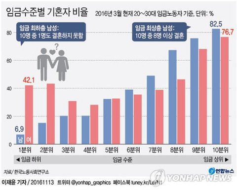 남성은 잘 벌지 못하는 이상 결혼을 포기하게 되고 여성이 원하는 최소 300버는 남자는 상위 30%이고 이상적으로 원하는 500-600버는 남자는 극소수거나 나이 지긋한 분들이니까요. 잘생기고 다정다감해도 돈 못벌면 꽝이잖아요. 통계가 증명합니다. 여성은 자신보다 경제력이 떨어지는 남성을 먹여살릴 각오로 결혼하지 않습니다.