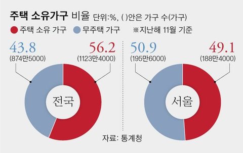 대한민국에 집 없이 사는 인구가 대충 반정도는 됩니다. 집있으면 그거로 이미 상위 50%인거에요. 나머지 절반은 월세, 전세로 살고있습니다. 집 가지고 대한민국에서 사는게 쉬운게 아니에요. 판에서는 다들 자가로 집가지고 있고 결혼할 때, 서울 경기권에 집 가지고 결혼한다 하는데 현실은 통계로 드러납니다.