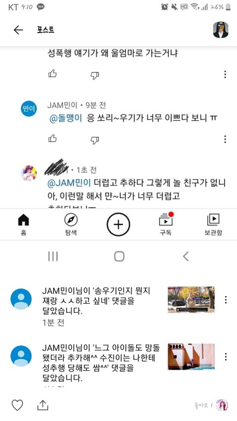 지인의 유튜브채널에 달린 수진에 관한 선넘댓