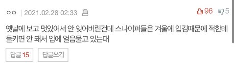 한겨울에 나랑 쟝은 적에게 들키지 않기 위해 숨어있었음. 근데 한겨울이니까 사람이 숨 쉴때 입김이 나올거 아니야? 그래서 나랑 쟝은 입 안에 얼음을 물고 있었음. 입김 때문에 적에게 들켜서 죽는 사례가 많았기 때문임.