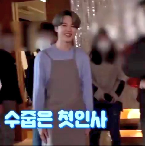 백종원샘이랑 처음 만났을때도 낯가렸어ㅋㅋ 지민이 낯가릴 때 차렷자세로 허벅지에 손 붙이고 수줍게 웃어