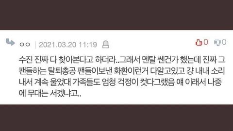 여동생 영향이 젤 컸을듯 .. 수진이 여동생 사진도 한번 공개했었어서 알 사람은 다 알텐데.. 글고 평소에도 언니 얘기 많이 하고다녔을테고 .. 부모님도 부모님이지만 아직 어린나이인데 친구들 시선 견디는거 진짜 많이 힘들었을듯...