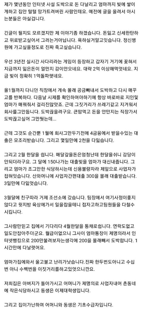 가까운 사람이 도박중독이어서 아는데.. 중독자들의 제일 역겨운 점이 저거임. 눈물로 반성하는거.. 그게 반성하는척일뿐이라는건 본인 스스로도 알고 있음. 진짜 끊을사람은 상담치료를 받거나 입원을 하지 다신 안할께 라면 울고불고 하지 않음. 마음 깊은곳에서 나는 쓰레기다라고 생각면서도 한판만 터지면 된다 이 마음이 공존하는거임. 흔히 사람들이 착각하는게 도박중독은 의지의 문제가 아님. 이미 뇌의 문제임. 의지로 끊을수 있는 사람들은 애초에 중독에 빠질일도 없음.