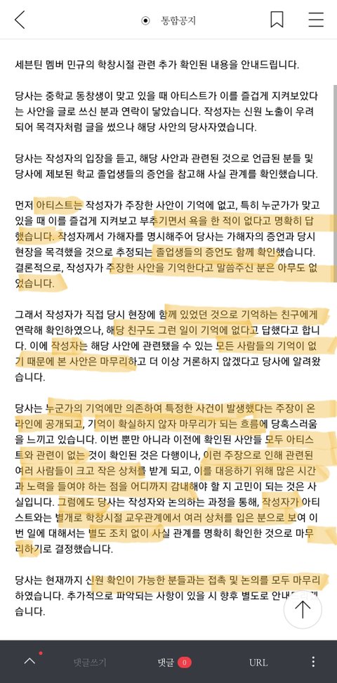 글쓴 : 민규가 폭력 방관에 폭언했다 주장
