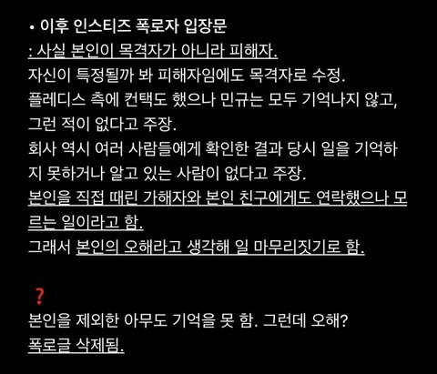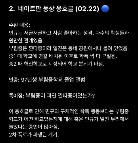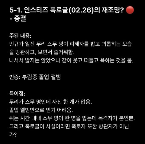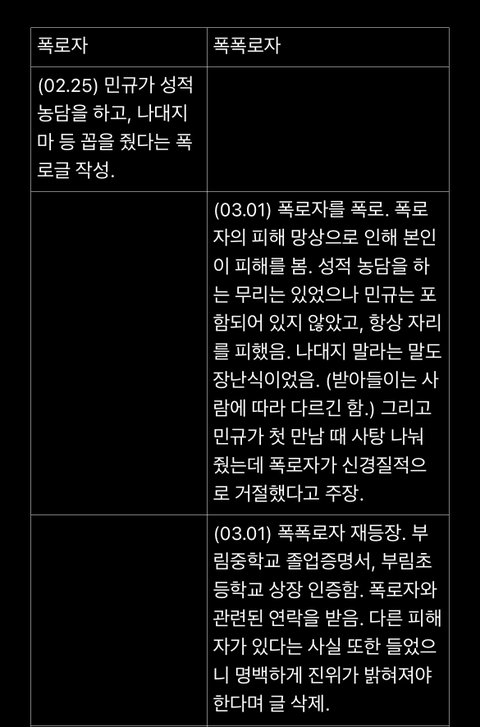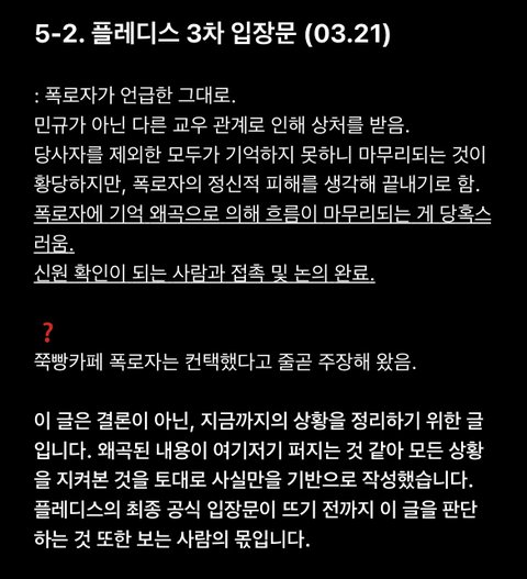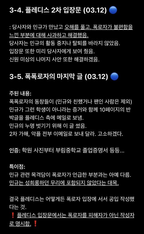민규가 알았으면 하는거 ‘중립을 외친 팬들이 널 못 믿어서 그런게 아니라는거(중립이라 말 안하면 오히려 어그로들이 더 심한 욕설을 다니까 먹이주기 싫었던거야)’, ‘탈퇴총공 팬들이 참여한거 아니라는거(여시에서 독자적으로 진행)’ 딱 이 두가지야. 민규야 팬들은 처음부터 널 믿고 지켜봐왔어. 널 너무 사랑하는데 지켜줄 수 없는 무력함에 많이도 울었어 그러니 팬들이 등을 돌렸다 생각 하지마. 내 편이라 생각했던 사람들이 등을 돌릴때의 공포와 슬픔, 분노를 잘 알아 하지만 그런 일 없었어 민규야 중립이란 말이 너에게 힘이되지 않았을 걸 알아 그래서 마음이 찢어져 그게 너에게 상처가 되지 않았길 오늘도 간절히 빌어
