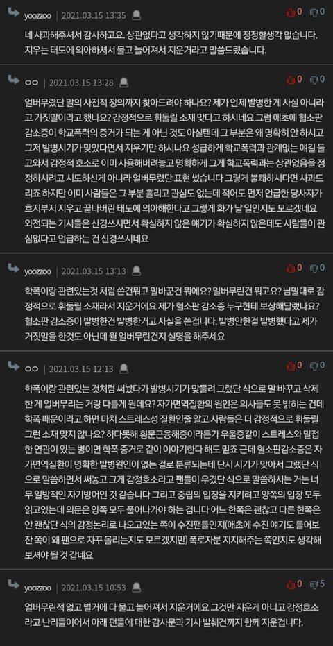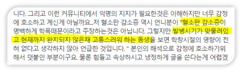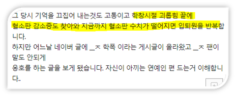 1. 폭로글에 폭로자 동생이 '학폭으로 인해 혈소판 감소증이 찾아왔다'고 씀 (1-2학년초)