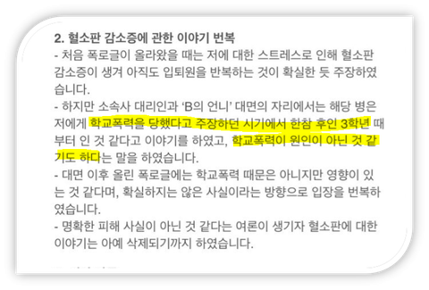 두 번째로, 첫 폭로글에서 '혈소판 감소증'에 대한 언급은 피해를 주장하는 동생 A 씨가 직접했음. 그런데 이후에 해명문에 쓴 내용을 보면 B씨가 "현재까지 완치되지 않은채 고통스러워 하는 동생을 보면 학창시절의 영향이 전혀 없다고 생각하지 않아 언급한 것입니다." 본인이 언급했다고 함. 다시 말해 정말 이상한 점은, 분명 폭로글에서는 당사자인 A씨가 '혈소판 감소증'에 대하여 언급했는데, 이후에는 B씨가 아직까지 병으로 힘들어하는 동생을 보고 언급했다고 말함. 이건 절대로 착각 할 수가 없는 부분임. 즉, 폭로글에 A씨가 직접 썼다고 하는 부분을 사실은 언니인 B씨가 썼다는 얘기임. 그리고 그 점이 발각될까봐 해당 부분을 삭제한 것.
