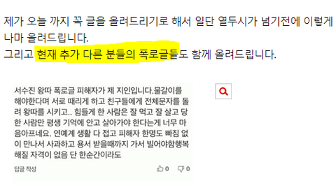 그리고 첫 폭로글에 첨부했던 다른 사람의 폭로글이라는거, 인증도 안된 내용어딘가의 댓글인지 뭔지 모르겠지만 '지인'이라면서 인증도 없이 썼고. 출처도 정체도 명확하지 않은 내용을 폭로글에 추가 폭로라면서 첨부한것도 문제지만. 피해자가 지인이라는 저 댓글이 선뜻 명확히 이해안되는건 나뿐인가.