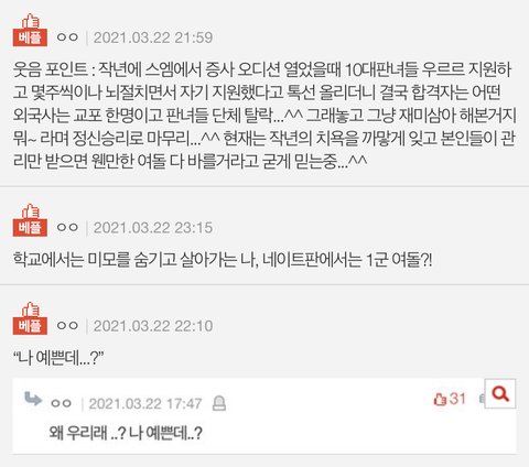 수진 못생긴편이냐는 글 보고왔는데 이년들은 자기들이 연예인급으로 관리받으면 아이린이라도 될 줄 앎 웃기고들 있다 일단 오디션부터 광속탈락일 애들이 누굴 욕해