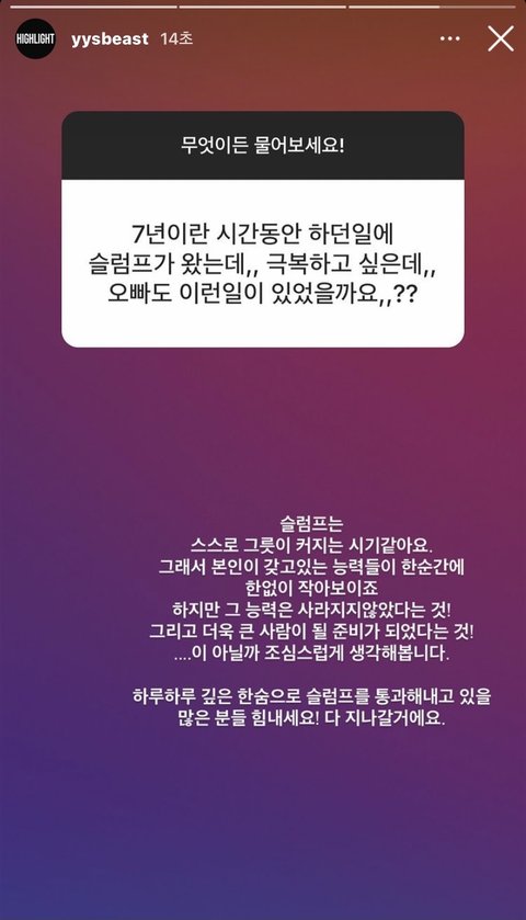 이겨내는 법은 아니지만,, 전에 올라온 양요섭 무물인데 말이 너무 좋고 예뻐 그릇이 커지는 시기 같대ㅠㅠ