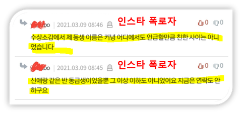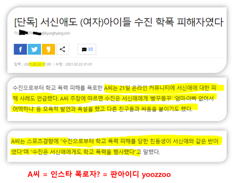 2. 인터뷰에 응한 A씨의 동생은 서수진 학폭의 피해자이며 서신애와 같은 반이었음. 즉 인스타폭로자일 확률이 매우높음. (뉴스기사 중 A씨 = 인스타폭로자)