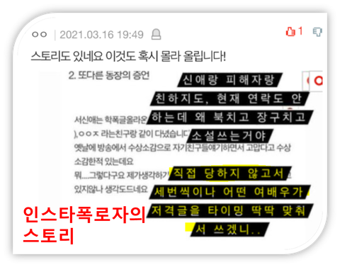 1. 배우가 스토리를 올린 날, 인스타폭로자의 기사를 단독으로 쓰는 이모기자의 기사에 A씨의 인터뷰 내용이 단독 공개