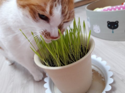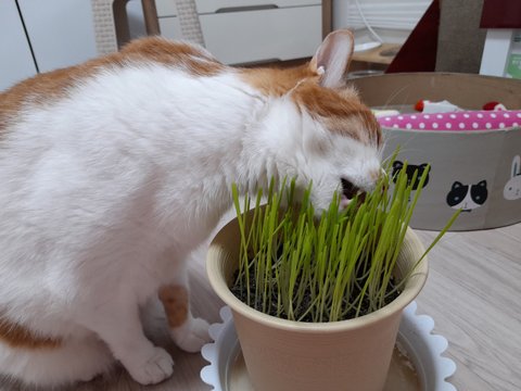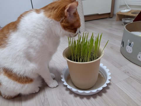 몸무게 감량한 도칠이에게 큰 화분에 고양이풀 심어서 선물함.
