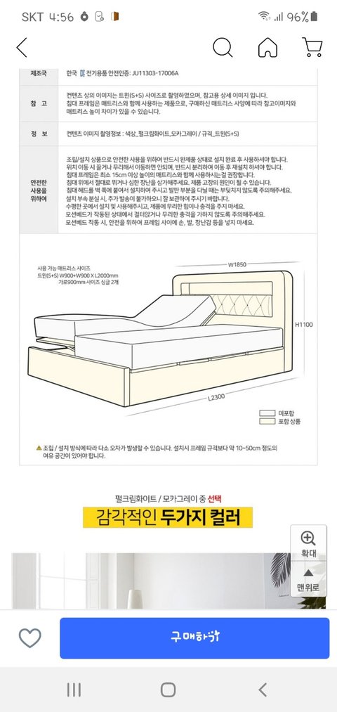 인터넷으로 벨리타LED모션베드 전동침대 트윈싱글(S+S)를 구매하였습니다