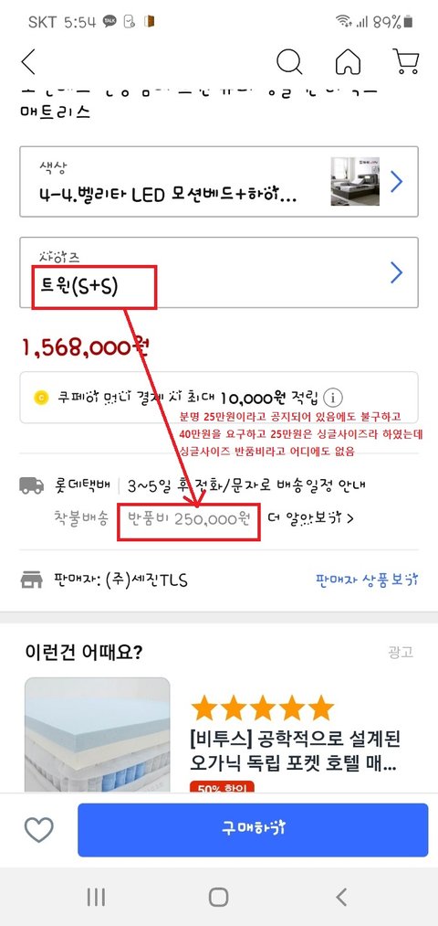 배송비 19만원에 반품비 40만원을 입금해줘야 반품도 처리된다고 하더라구요 침대구매금액이 1,568,000원이 입금된 상황인데
