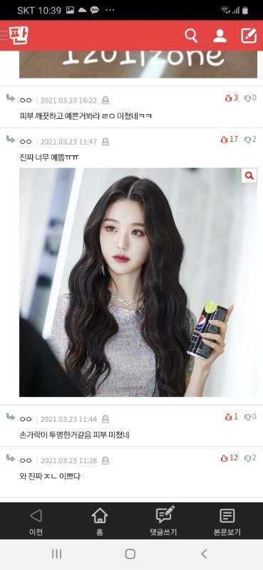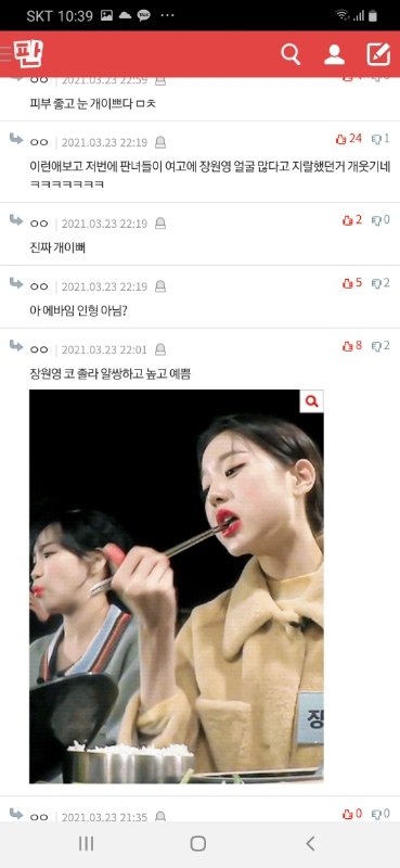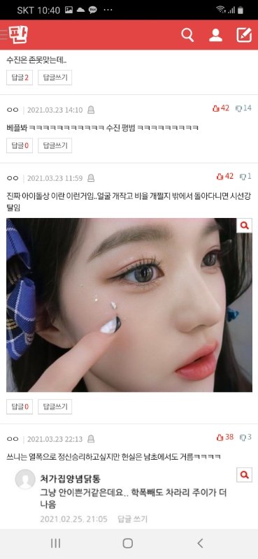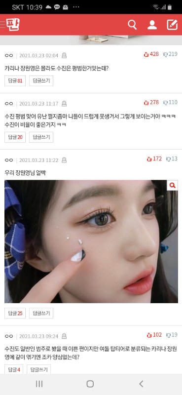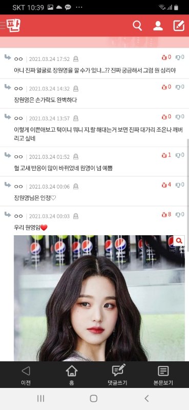 그리고 판에 열폭 ㅈㄴ 많이 한다고들 하는데 솔직히 작년엔 많긴 했지만 지금당장 판만봐도 장원영 손민수 메컵이 톡선가고, 장원영 관련 찬양글,베플은 다 장원영 얼굴 찬양글임ㄹㅇ