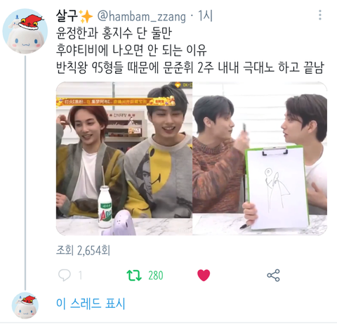 내보기엔 셉내 먹이사슬 원탑은 윤정한이고 그 조력자가 홍지수 같어ㅋㅋㅋ