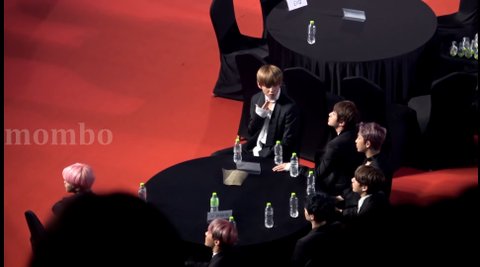 가온 수상소감 처음부터 끝까지 로제가 했는데 김석진이 뭐라 물어봤는데 0:11 초에 뷔가 김석진한테 로제라 그런 건 입모양으로 알겠고 0:13초에 입모양이 " 목소리가 이뻐"라고 그런거임 아니 "목이 아퍼"라고 한거임?