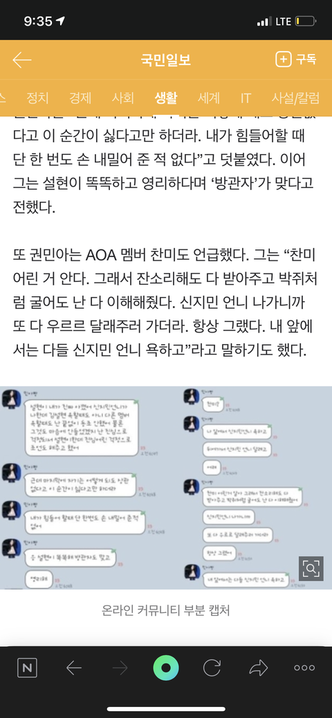 뭐 어쩌라는거임 저거보면 지민도 친해지려 겁나 노력했구만 ㅋ 폭로내용도 괴롭힘이라기엔 엥? 스러운데다가, 폭로당시 극단적인 사진올리고 자살암시하고해서 상대방은 대응도 못하게 하고 본인 입으로 증거도 다 있다면서 정작 명확하게 밝혀줄 수사는 본인이 스스로 거부하는데 뭘보고 자기말 믿으라는지 모르겠음. 믿음 하나도 안가고 피해입은 지민, AOA멤버들만불쌍함