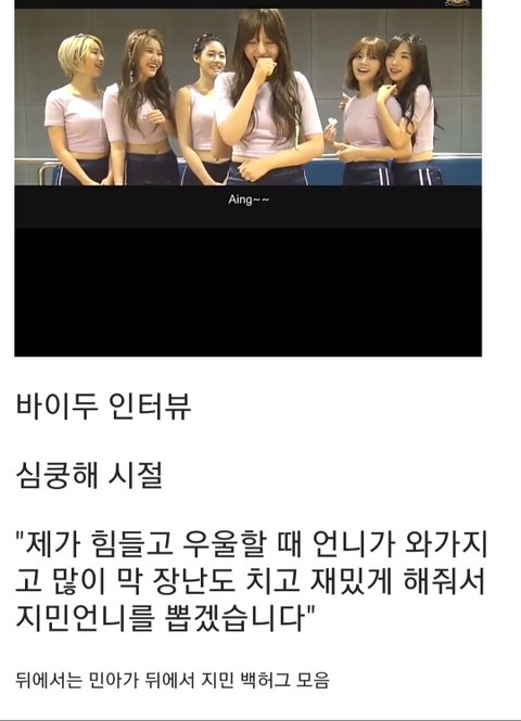 사진은 민아가 막내 설현에게 자주 하던 행동임. 민아 논리대로라면 설현은 이 기분 나쁜 행동으로 민아 고소해도 됨. 민아 연습 자주 늦고 녹음하는데 연습 너무 안해와서 보컬레슨 좀 들으랬는데 끝까지 활동기간중 총 3번밖에 안갔다고 민아 본인이 웃으며 말함. 살인적 스케줄 많았던 설현은 잠 줄여가며 훨 많이 갔음. 연습 빠지니 지민한테 혼이 자주난듯 탈퇴하고 일년 후 손목 그은 자해 사진 올리며 자기 힘든거 다 지민때문이라함 근데 폭로글 정독해보면 본인이 헤어라인 시술받다가 연습 늦은 것도 지민한테 또 혼날까봐 못갔다며 다 지민탓이다 (이건 민아 인스타 폭로글에 쓰여있는 내용임) 자해사진 보고 놀란 대중이 편들어주자 다음날 고독방들어가서 '단독cf 어떤 게 어울리나 얘기하는데 설현 나쁘게 만들고 설현 cf들 자기가 하는 생각 하더라'. 다른 멤버들 혹시나 자해 또 할까 전부 악플 심하게 받으면서도 침묵중.