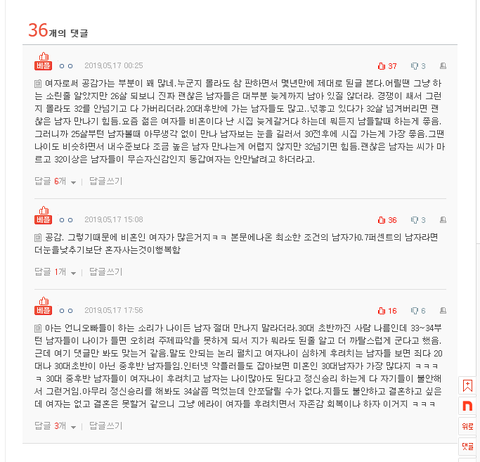 20대 중반 여성들에게 하고 싶은 말은, 그때부터 괜찮고 장래성있고 사지 멀쩡한 남자들에 대해 열심히 관심을 가지라는것. 그런데 20대 중반부터 본격적으로 경제력과 자유를 갖춰서 '문화생활과 여행을 즐기며 화려한 싱글라이프를 즐기자^^ 결혼? 그런건 나중에 생각해봐야지..'라는 전형적인 패턴으로 살게되면 나중에 '괜찮은 남자는 씨가 말랐어...'라는 역시 전형적인 하소연을 하게되는 신세를 비껴가기 쉽지 않다.
