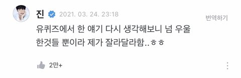 위버스에서 진이 말한 건데 유퀴즈 인터뷰 내용이 너무 우울해서 잘라달라 한 거래 진 분량이 조금 적어서 속상하긴 하지만 너무 뭐라 하지는 말자 ㅠㅠ