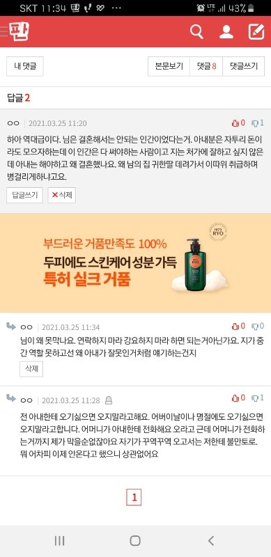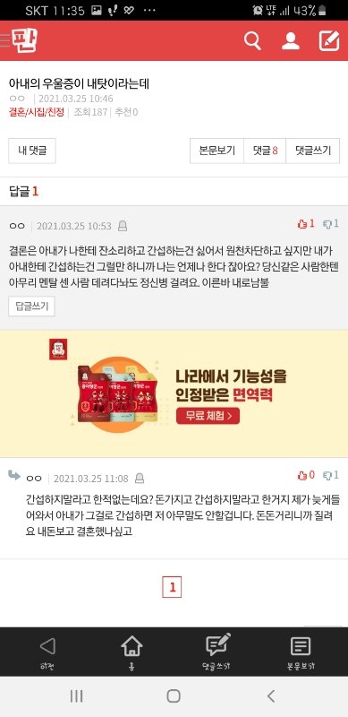 새벽까지 잠도 못자게 ㅈㄹㅈㄹ하니까 질린다 (전 아내가 또그럴까봐 세게 말하는겁니다 다음엔 절대 늦지말라고)