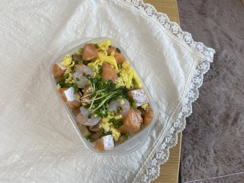 초밥 밥 특유의 새콤달콤한 맛을 좋아해서 호다닥 연어장 담가서 만든 지라시스시 비슷하게 만들어본 거예요! 계란도 미림이랑 설탕이랑 소금이랑 간 해서 타마고 초밥에 들어가는 달짝찌근한 맛 내보고, 연근 같은 뿌리 채소는 단짠으로 졸여서 식감만 더해줬어요ㅎㅅㅎ