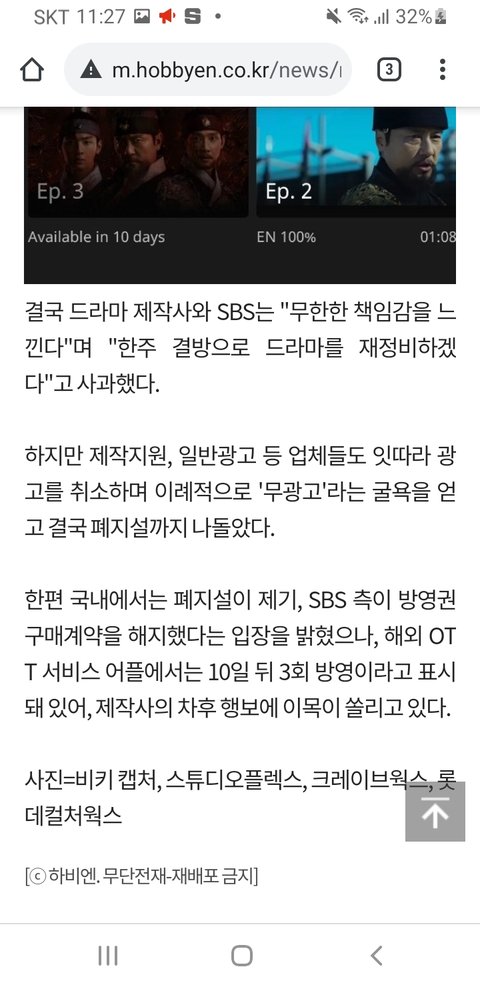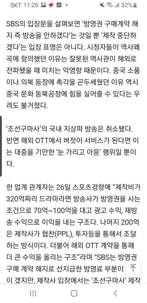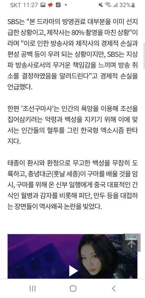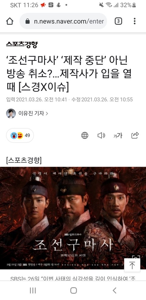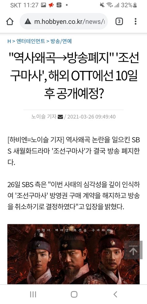 얘들아 조선구마사 SBS에서 국내 방영만 취소한거야 해외 송출은 한다고 해. 제작사들이 판권을 갖고 있어서 방영 중지가 아닌 아예 폐지를 시켜야 해외 송출이 안 되는거야