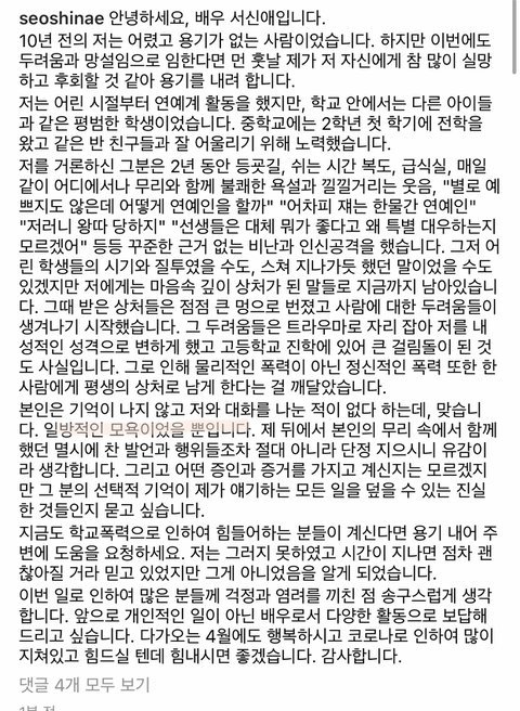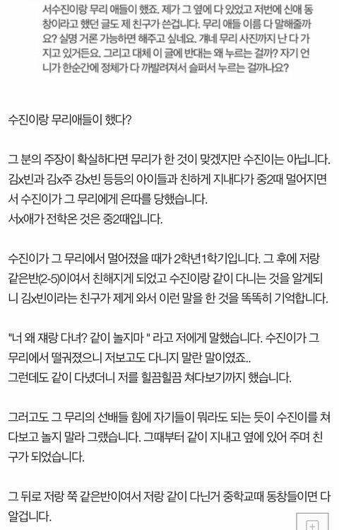 1. 인스타폭로자 동생분이랑 수진이랑 둘 다 친구였다는 증인분 -> 1학년이랑 2학년 1학기까지 일진무리에서 수진은 은따였음, 그리고 2학년 2학기때 일진무리에서 팽당하고 증인분이랑 같이 학교를 다녔고, 수진은 팽당하고도 그 무리한테 괴롭힘 받은 적 있다고 하심