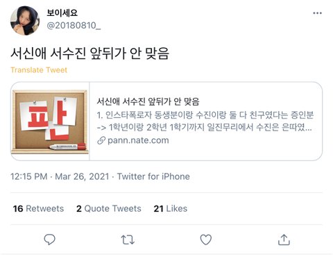 2. 욕설 등등으로 증인 쉴드글 삭제하신 증인분 -> 1학년 2학기때부터 그 무리에서 왕따였고, 그 일진 무리가 서신애한테 욕한 것은 맞으나, 수진은 애초에 왕따이고 팽당했기에 그 사실을 모를 수 밖에 없다고 하심