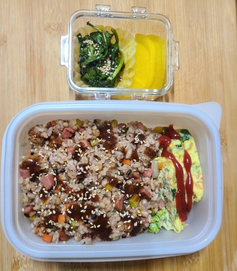 전자렌지에 데워 먹으라고 밥도 따로 싸고 바빠서 강아지 밥 주고 갈테니 기다리지 말고 비벼놔줘~ 했더니 사진에 있는 나물반찬에 계란 장조림에 김까지 때려넣어서