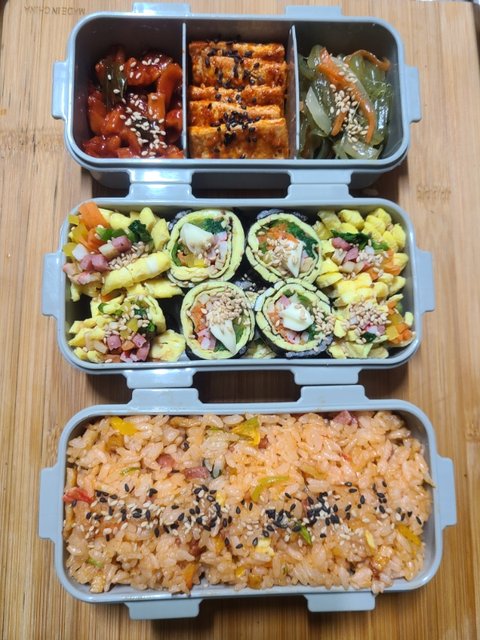무말랭이, 두부조림, 미역줄기 볶음, 꽃김밥, 케찹 볶음밥 이예요