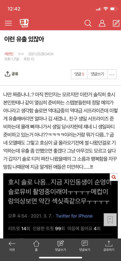나랑 정반대인 애들 너무 부럽다 나 진짜 좋아하는 분야 말고는 스포 들어도 별 생각 없는데 세븐틴 관련된 스포는 세븐틴 멤버들이 하는거 제외하고 진짜 예민?하다 그래야되나 이런 스포 진짜 병적으로 싫어함.. 콘서트 갈때도 오투유 막콘만 갔었는데 첫콘 시작하고 막콘 갈때까지 그땐 판 안할때라서 인스타랑 트위터 한번도 안들어감ㅋㅋㅋㅋㅋㅋㅋㅋ습관적으로 들어가면 소리지르면서 나올정도로 이런 스포 진짜 병적으로 싫어함 호시가 말해주는거나 공식 기사가 나는게 아닌 일반인 스텝이 유출하는거 진짜 너무 싫음 저 유출은 스텝분이 지인한테 말하고 그 지인이 트위터에 올린거인거 같은데 본인도 저렇게 알티 탈줄은 몰랐겠지만 트위터같은 공개적인 sns에는 안올리는게 예의라고 생각함.. 나처럼 스포 싫어하는 팬들도 있지만 무엇보다 호시가 제일 싫어할거 같은데.. 이때까지 솔로 뜬다는 공식적인 떡밥도 아무것도 없었던거 보니까 호시 진짜 입 근질근질한거 엄청 참은거 같은데 진짜 예의 아니라고 생각해 난 저런거 진짜 김팍식