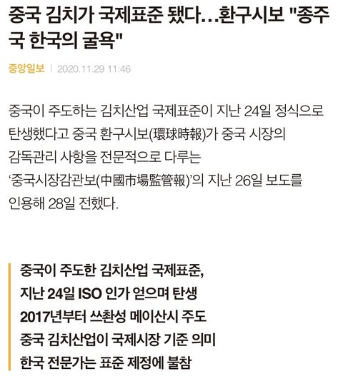 + 이시국 아니라고 하는 댓 있어서 올리는데 파오차이 이번일이 아니라 작년 11월에 국제표준 인증됨 한복도 이번에 일어난 일이아니라 블랙핑크 how you like that (작년 6월 ) 도 중국이 엄청 ㅈㄹ 했고 그 전부터 ㅈㄹ 했음 그리고