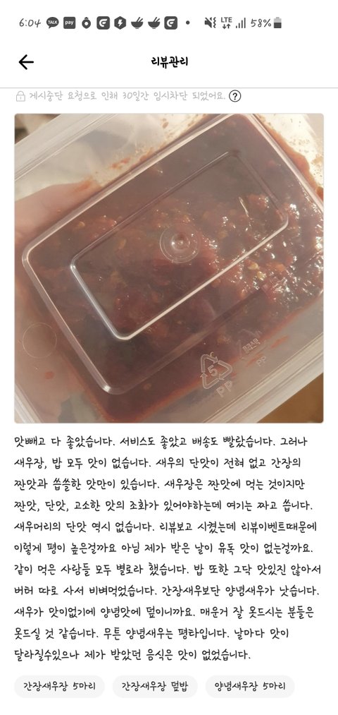 안녕하세요, 배민에 솔직하게 리뷰를 남겼지만 사장님으로부터 '내 마음에 안들어서 신고한다'라며 리뷰를 신고 당했습니다. 지난주에 한 새우장집에서 먹은 뒤 솔직하게 리뷰를 남겼습니다.(제가 남긴 다른 집들 리뷰도 첨부합니다 저 리뷰이벤트 참여한 거 아닌 이상 그저 솔직하게 남기는데..ㅜ)