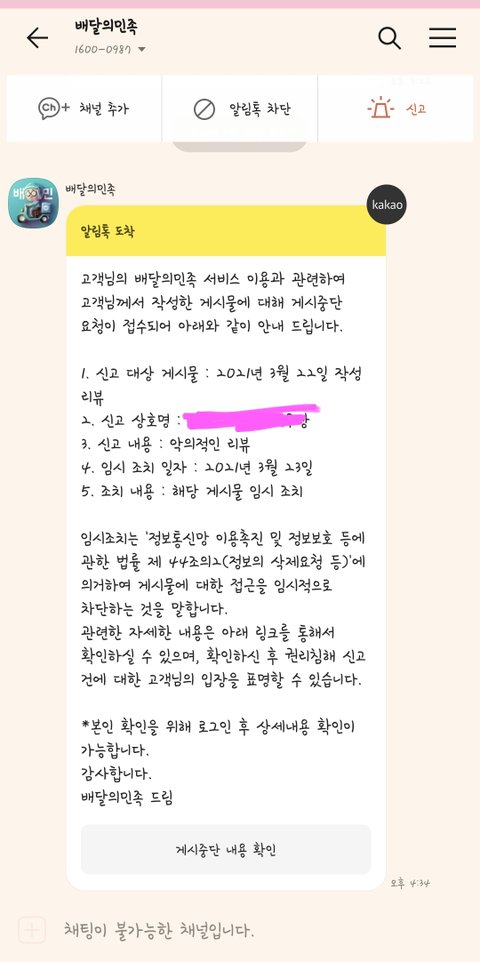 "솔직한 리뷰여도 일단 신고 들어오면 한 달 블라인드하는게 최선이다."라는 답변을 받았습니다.