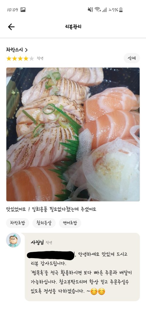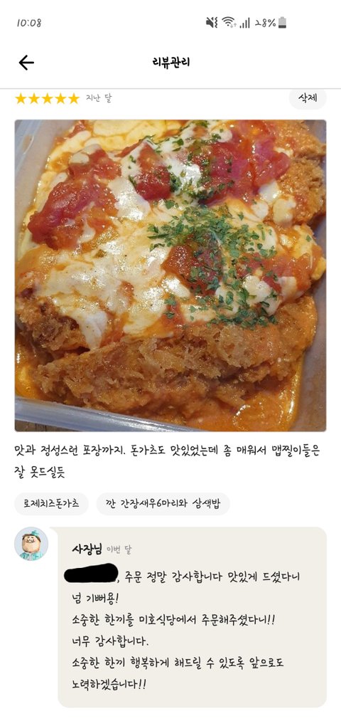 ※리뷰 하나 가지고 지랄하는게 아니라, 저는 소비자 권리를 침해하는 배민 리뷰 삭제/블라인드 시스템을 지적하고 싶습니다. 맛 없는 한 끼 먹은거야 굳이 이 식당 아니어도 배민에서 자주 겪는 일입니다. 다만 '사장 맘에 안들면 삭제 가능한' 시스템이란 걸 알게됐을 때, 이는 분명 개선돼야할 점이라 느꼈고 그 시작점으로 공론화를 위해 작성했습니다. 피곤하게 굴어야 뭐라도 바뀐다 생각합니다. 현 배민 리뷰 시스템은 고객의 솔직한 리뷰도 사장님 유리한 측으로 처리해주는 것 같습니다. 사장님도 '마음에 안들어서 악의적으로 신고'라고 말씀해주셨으니까요. 리뷰 이벤트로 평점 올리는 건 마케팅이지만, 솔직한 리뷰를 임의로 삭제/블라인드 처리하는 것은 소비자 권리 침해입니다. 사장님 답글 기능은 왜있습니까? 사장님께서 충분히 답글 다셔도 됐는데 맘에 안들어 삭제 요청하신겁니다.