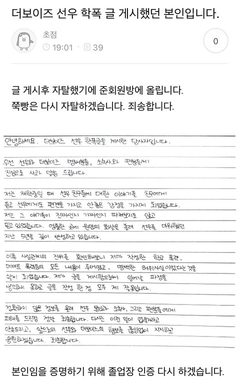 선우 데폭주작한 애 사과문 올라왔어