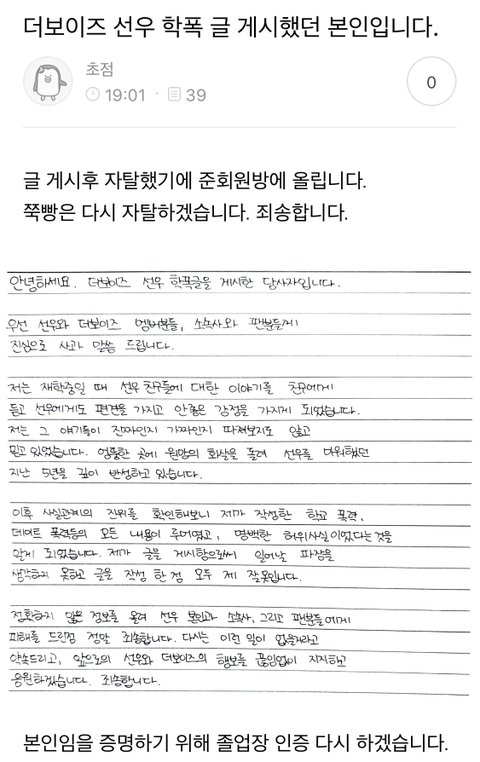 더보이즈 선우 학폭 주작글 당사자 사과문