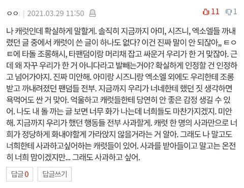 그래 너네 중엔 타돌 안 깐 애들도 있을테니 억울하기도 하겠지. 근데 원래 이런 상황에선 억울함을 표출하고 다른 껀덕지 잡는 것 보단 이 캐럿처럼 대신 사과해야 하는 거 아니야? 솔직히, 이 댓글같은 분위기였으면 이런 식으로 일 커지지도 않았어.