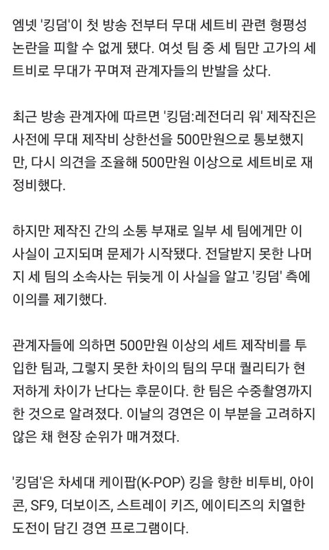 500만원 이상 쓰지 말라했는데 3팀이 500만원 이상 써버려서 다시 500만원 이상으로 제작비를 바꿨는데 나머지 3팀은 그 소식 전달이 안된거임? ㅋㅋㅋㅋㅋㅋㅋㅋㅋ 이와중에 에이티즈는 그걸 지원 받은거고? ㅋㅋㅋㅋㅋㅋㅋㅋㅋㅋㅋㅋㅋㅋㅋㅋㅋ 그리고 현저히 무대가 차이나는데 그상태로 현장투표?ㅋㅋㅋㅋㅋㅋㅋㅋ 시⃫발⃫ 개빡침