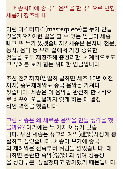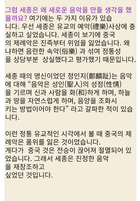 세종대왕이 종묘제례악을 만든 이유는 중국음악만 나오는 현실이 안타까워서 조선의 고유한 것을 만들고자 한 것이었어