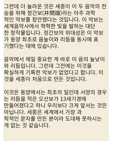 또 종묘제례악을 후손들에게 남겨주기 위해 세종은 악보까지 만들었기에 세종의 천재성에 감탄하게 되지