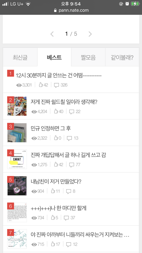 민규글 인증하고 쓰기로했고 무슴내용이든 인증없음 ㅁㄱ하기로 했잔아 베스트보면알겟지만 지금 관음 걍 엔터급임 새벽에는 ㅇㄱㄹ들 한번에 7명들어와서 지들끼리 추천수조작하고 그랬음 추반 남발하지말고 댓글로 얘기하고 파생글 만들지않고 공지 잘읽고 오늘도 잘하자