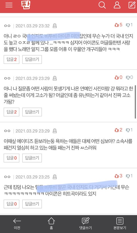 내가수 올려주고 타가수 내려치는 댓글에 추천 안눌렀음 좋겠어 내가수 좋게 봐주는건 좋은데 어그로댓글이나 글은 그냥 먹금하자 다들 예민하니까