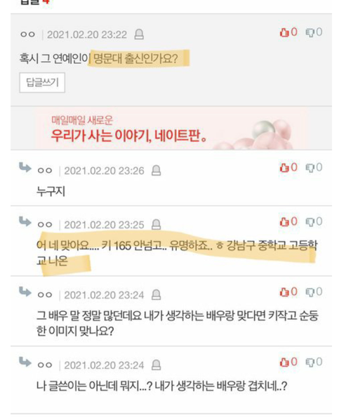댓글들을 보면 최소 두 명이 1분만에 박혜수님임을 암시하는 댓글을 연이어 다는데 우연히 이 댓글에 두 명이 1분만에 박혜수님을 떠올려 댓글을 다는 것은 확률상 불가능에 가깝다고 봅니다. 게다가 원글 쓴 사람은 후에 본인은 댓글을 전혀 달지 않았다고 밝혔는데 그렇다면 더욱 희박한 확률이죠. 게다가 박혜수님이 한 것이 아니라면 사실이 아닌 일에 1분만에 두 명이 동시에 박혜수님을 실수로 지목하는 것은 불가능에 가까운 일이라고 봅니다.