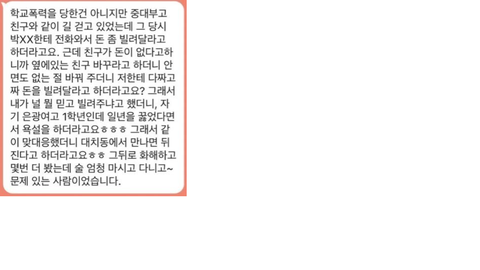 하나의 예를 들자면 아래 캡처했는데, 저는 카톡 남긴 분과 박혜수님 관계가 상상이 안 되고 도무지 모르겠습니다. 박혜수님이 처음 보는 본인에게 욕을 하고 금전 갈취를 하려 했다는 것인데, 그런 관계에서 화해를 하고 몇 번을 더 본다는 것 자체가 개연성이 없다고 봅니다. 이 외에도 개연성이 없어 보이는 글들이 많았고, 금전 갈취를 하고 돈을 안 주면 괴롭혔다는 익명의 증언이 많았습니다. 이해가 안 되는 건 박혜수님이 금전갈취를 했다는 건 본적도 들은 적도 없고 그런 사람이 학급 임원이 된다는 건 말이 안 된다고 중학교 동창들이 증언했다는 것입니다. 그리고 폭로자 측에서도 놀이터에서 폭행에 가담했다 안 했다 가지고 다툴 것이 아니라 금전 갈취와 협박이 드러나면 학폭이 명백해 지는 것인데 이에 대한 언급은 또 안 한다는 것입니다. 그래서 익명의 금전갈취 폭로도 신뢰성이 떨어진다고 봅니다.