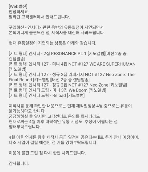 방금 문자 옴... 대체 물량을 어떻게 뽑았길래...?? 오프에 풀 물량 조금만 양보해주지 ㅅㅂ 진짜 짜증나죽겠음 드림 컴백 앨범 먼저 받게 생김
